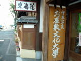 | 玄関脇に「伊東温泉 お座敷文化大学」の看板があります。芸者や座敷芸を体験することができるそうです。詳しくはこちら、お座敷文化大学HPをご覧ください。 |