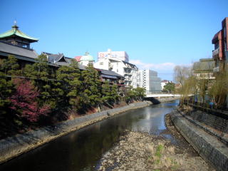 松川沿いに並ぶ木造3階建てのレトロな建物。右の写真、手前が東海館、奥の油差しの形をした望楼を持つのが旅館「いな葉」。残念なことにいな葉も2007年6月に閉館してしまいました。いな葉は大正末期の建築で国の登録有形文化財に指定されています。今後、宿としての営業再開を模索しているとのことですが(2008年3月現在)、この素晴らしい景観が守られることを願います。 |