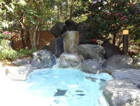 | 上段の湯は中段の湯と下段の湯を見下ろす位置にあって雰囲気も一番いい。湯温は温めで長湯ができそうですが塩素臭が残念でした。 |