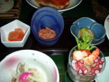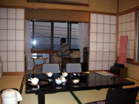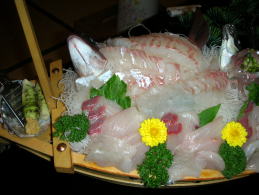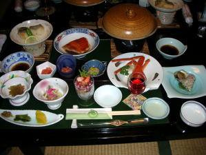 | 食事は夕食、朝食とも部屋食。新鮮な海の幸がずらりと並びます。舟盛が付いて12,000円は安い。 |