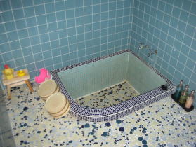 | ただし二人同時に入ったら、湯舟から溢れ出す湯量に見合うだけの排水口の大きさがないため、洗い場が洪水状態・・・要改善です。 |