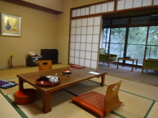 | 宿は「詩季亭」「海花亭」「石心亭」「本館」「別館」から成っていて、木造二階建ての本館が一番古い建物とのことですが、トイレはウオッシュレット、それに温泉が出る部屋風呂までついています。 |