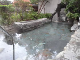 | 内湯、露天風呂ともかけ流しとろ過循環の併用。どちらにも熱湯とぬる湯二つの湯舟があります。 |