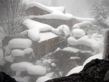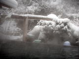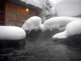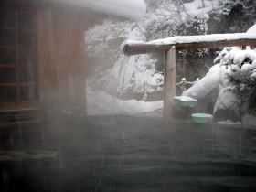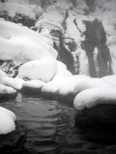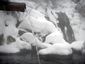 | 下の写真は石楠花の湯から見下ろした滝見の湯です。ずっと眺めていたい雪景色でした。 |