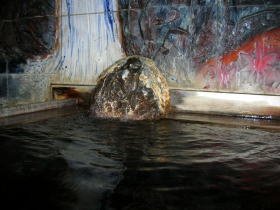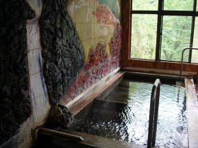 | 湯舟は板で仕切られていて、お湯が直接注ぎ込む方が熱め、仕切り板の上部から湯が流れ込む右手の方が温めになっています。 |
