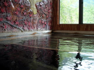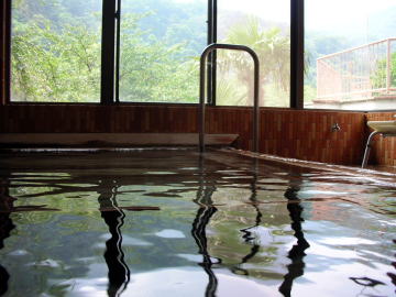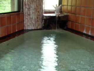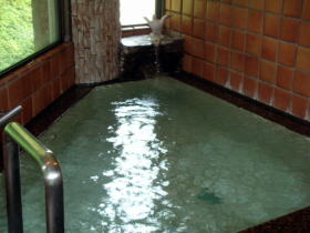 | お湯は温泉組合で管理している38〜45℃の源泉を合わせ、39℃に加熱して利用しています。ですから、「熱め」の浴槽も長湯ができる湯加減です。 |