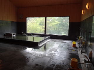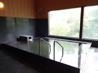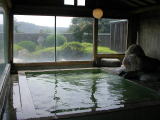 | 10人程はゆったり入れる湯舟には薄黄緑色をした透明な湯がバンバンかけ流されています。湯舟の脇に窓が大きくとられているので開放感があって気持ちがいい。窓の向こうには那珂川の支流、荒川が流れています。 |