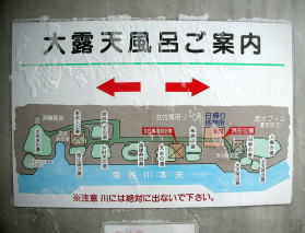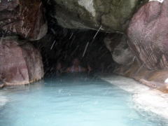 | 12個中最大の露天風呂。5、60人は余裕で入れそうな広さです。それにこの湯舟は大量の湯を注ぎ込んでいるせいでしょう、広いわりに温さを感じませんでした。さらに白い湯の花がたくさん浮遊していて乳青色をしています。気持ちが良いのでほとんどこの湯舟にいました。 |