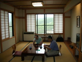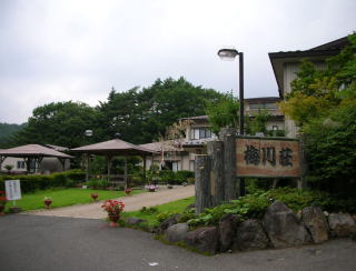 | 自称「温泉同好会」のおやじ3人で、梅川荘を訪れました。梅川荘は平成6年開業の新しい宿。数年前に増改築したばかりで真新しい館内が気持ちいい。 |