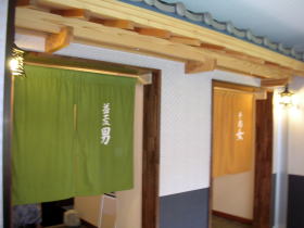 | 浴場入口の暖簾が面白い。男湯が「益荒男」、女湯が「手弱女」。 |