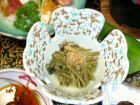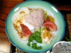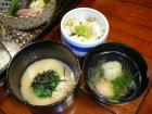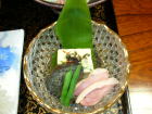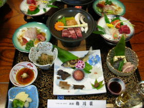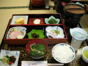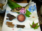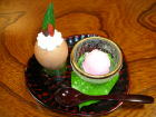 | 夕食は基本的に部屋で一回出し。鮎の焼き物が冷たかったのは残念ですが、どの料理もひと手間かけたもので美味しかったです。デザートのたまごプリンは卵の殻の中にプリンが詰まっていて美味。仲居さんに「おやじが食べるにはちょっと気恥ずかしいね」と言うと、「作ったのもおやじですから」(笑)・・・一本取られました。 |
