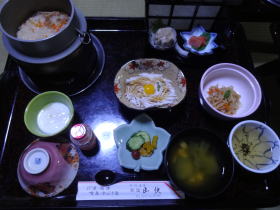 朝食も部屋でいただきます。この宿の朝食、素晴らしかったです。特別な目を引くような料理が出るわけではなく、家庭的な朝食ですが、箸が進みました。特に釜飯には感激。昨夜は少々飲みすぎましたが、一粒残さずいただきました。