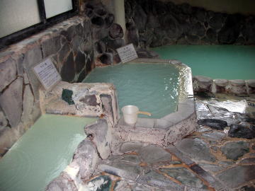 湯舟によって色が違うのは深さや湯の注入量が違うからでしょう。青白く濁ったpH2.6の酸性硫黄泉は浴感満点! 素晴らしいです。 |
