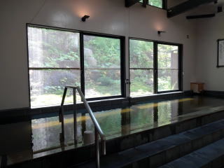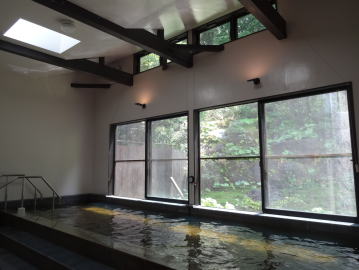 | 細長い湯舟に薄黄緑色の透明な湯がかけ流されています。 |