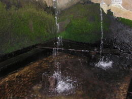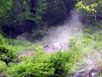 湯小屋の裏手にある源泉口からは溢れた湯が斜面を滝のように流れ落ちている。 |
