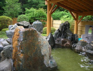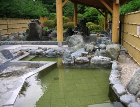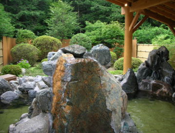 | オープン当初は左下の写真のような湯舟だけだったのですが、大きな岩風呂が増設されてさらに充実した露天風呂になりました。内湯に比べて温度が高めです。露天であることを考慮して加水の量を少なくしているのでしょう。 |