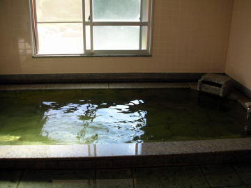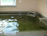 | 黄緑色に透き通った湯が溢れています。源泉温度が54.5℃と高いため、加水してかけ流しているそうです。pH8.9というアルカリ性の湯でかなりツルスベ感があります。 |