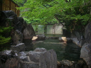 源泉は「ぢの湯」と「めの湯」。源泉かけ流しの湯は適温で滑らかな肌触り。いつまでも入っていたい・・・そんな露天風呂です。 |