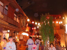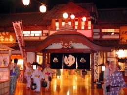| ●広小路 中央に火の見櫓がある広場には寿司屋・蕎麦屋・甘味処・みやげ物屋などが軒を連ねる。なんでも建築は宮大工さんが手がけ、釘一本使われていないとか。湯上りにぶらり、食後にぶらり・・・浴衣だし、館内の会計は通行手形のバーコードを利用して帰りに清算するシステムなので楽ちんです。 |
