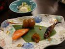 焼き物: 蕪と鱒蕗の薹味噌 富貴豆饅頭 |