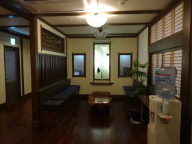 大浴場の入口には休憩所があります。冷たい水も用意されていて湯上りに一息つくことができます。