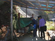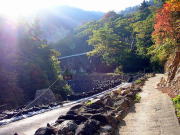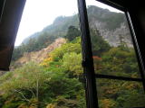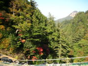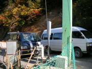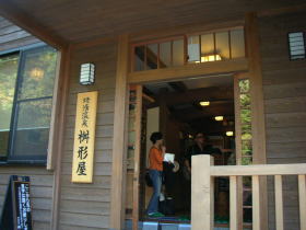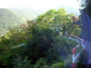 いよいよ出発。標高624mの峠駅から1300mの姥湯温泉まで一気に上ります。舗装こそされていますが、車一台通るのがやっとの山道で、対向車が来たときはどちらかが(原則は上りの車)すれ違いのできる所までバックします。宿までは8kmほどですが、「この日は土曜日とあって日帰り入浴客の車が多いので25分ほどかかるでしょう」との宿の方の話です。 |