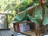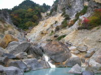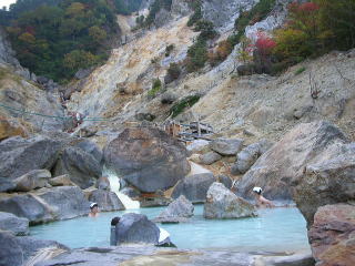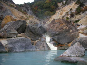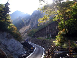 「下の川は姥湯温泉の酸性泉が流れ込んでいるので魚はいません」というような説明を聞きながら送迎バス揺られているうちに駐車場に到着。荷物だけロープウエイに乗せ、あとは数分間の歩き(それほどの距離ではないのでご安心を)。 |