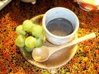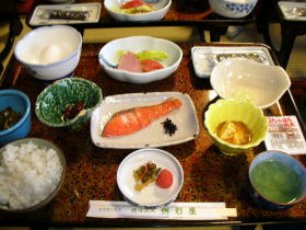 メニューは清く正しい旅館の朝食という感じ。前の晩飲み過ぎで疲れた胃にはちょうどいい食事です。よく納豆は容器のままかき混ぜなければならない宿が多いのですが、ちゃんと器が用意されていたのには感激しました。 |
