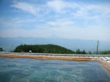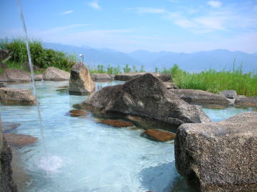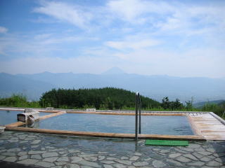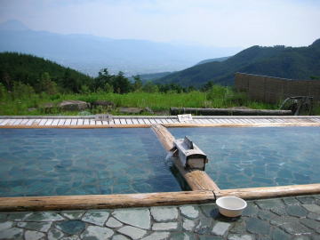 | まさしく絶景の露天風呂。眼下に甲府盆地、左手に大菩薩連山、正面に御坂山系の山々、そして富士山・・・。春には桃の花で文字どおり桃色に染まった甲府盆地を眺められるといいますし、「星空が天井」というキャッチフレーズどおり、星空を仰ぎながらの入浴も格別だそうです。 |