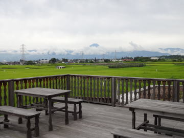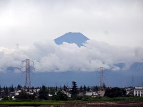| 休憩所からは富士山が見えます。左の写真では富士山がずいぶん小さく写っていますが、視覚的には右のズームした写真のように見えます。本当は湯に浸かりながら眺められるといいのですが、周囲は田んぼと住宅地なので、残念ながら浴場は目隠しで囲まれています。 |