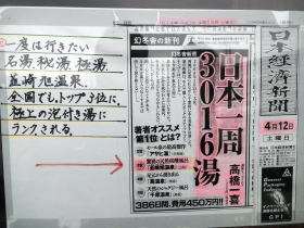 館内には温泉エッセイスト高橋一喜さんの『日本一周3016湯』で著者オススメ第3位になったという新聞記事が貼られていました。 |