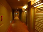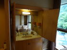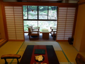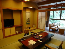 | 早割プランで1泊1人21,114円(税込)の部屋なのですが、正直値段の割にはチープな印象。ドア等いかにも鉄筋旅館を改装したのが見て取れるし、広縁の壁には雨漏りの跡が・・・。入口が空いていたので隣の部屋をちょっと覗いてみたら、広くてきれい。ドアも全く違っています。これが4千円の差かなと・・・。慶雲館には5万円位の部屋もあります。 |