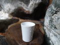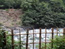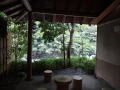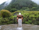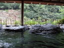 | 早川の渓流沿いにある堂々たる佇まいの大野天風呂。早川流域で産出される白鳳石で造った湯舟だそうです。湯口にコップがあるので飲んでみると、かすかに硫黄香があっていかにも温泉を飲んでいるという感じ。柔らかくて飲みやすいお湯です。 |