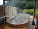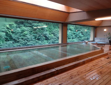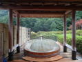 | 4階にある、慶雲館の顔と言ってもいい展望野天風呂。古代檜で造った楕円形の美しい湯舟は3〜4人はゆったり入れるサイズ。湯はやや温めで渓谷の木々を見ながらいつまでも浸かっていたい、上がるのが惜しくなる野天風呂です。 |