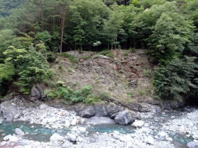 | 部屋からの眺めはなかなか。対岸にフォッサマグナ(大地溝帯)の西縁「糸魚川静岡構造線」の露呈岩相が見えます。 |