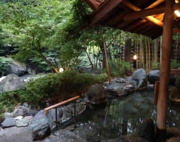 | 貸切り野天風呂は「川音」と「瀬音」の2つあり、午後10時までは予約制、それ以後は空いていれば自由に利用できます。 |