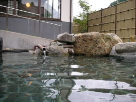 湧出時点の泉温が32℃弱なので浴槽内は30℃程度でしょうか。源泉と加熱湯を交互に入る人は少なく、皆さん(10人程)源泉浴槽に入りっぱなし。加熱浴槽はガラガラ・・・お陰さまで記念の写真を撮ることができました(上2枚と左)。