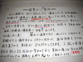 湯舟は男女別に内湯と露天風呂がひとつずつあります。脱衣所には説明書きが貼ってあり、温泉のことがよくわかって楽しい。 |