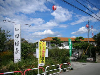 | 中央自動車道甲府昭和ICを降りて国道20号線を韮崎方面に進み、立体交差の徳行西を左折し、県道5号線を200〜300m行った先の5叉路(「山口温泉」の看板あり)を右斜め手前に折れて道なりに住宅地の中を進むと到着します。同じ山梨県内の正徳寺温泉初花もそうですが、「こんな所に?!」と思うような立地条件で、ある意味「秘湯」と言えるかも。 |