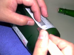 そういうときはカッターナイフでラベルと瓶の間の糊を押しのけるように少しずつ剥がすしかありません。格闘すること30分、残り三分の一くらいのところで短気をおこし、台無しにしてしまうということもままあります。 |