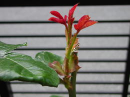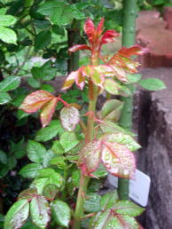 間もなく左の写真のように芽が伸びてくるので、5枚葉がまた6柄を越えたところで同じように2段、3段とピンチを繰り返します。フロリバンダ(四季咲き中輪系)は2段目で花を咲かせてもかまいません。 |