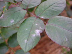 まず病気の葉を取り除きます。落葉したものもすべて拾って捨てます。そして黒点病の特効薬サプロール(1000〜2000倍)に、ついでですから殺虫剤を加えて散布します。その際倍率に注意してください。濃すぎると薬害が出ます。 |
