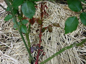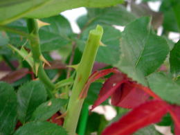 | ただし、つるバラのシュートはピンチしません。途中で折ったり曲げたりせずに支柱を立てて12月か1月の誘引の時期までひたすらまっすぐに伸ばします。 |