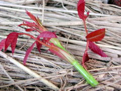 株が元気なら根元から赤っぽい、太くて勢いのある芽が伸びてきます。枝の途中から伸びる途中シュートと区別して、ベーサルシュートといいます。