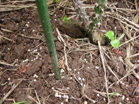 株の周りに化成肥料か配合肥料をひと握り、パラパラとまいて軽く耕し、そのあとたっぷり水をかけます。 |