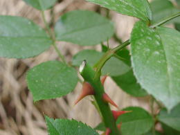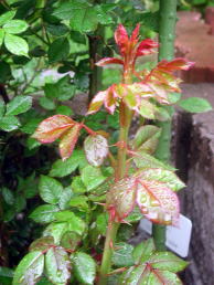 5月、6月になると株の根元から、太くて勢いのよい新梢が伸びてきます。これはシュートといって来年たくさん花をつける大事な枝です。ハイブリッド・ティーやフロリバンダのシュートは30cmくらい伸びたところで詰めてやりますが(「ピンチ」といって、6月の手入れで説明します)、つるバラは折ったり切ったりしてはいけません。冬の誘引の時までひたすら上へ上へと伸ばしてやります。 写真はつるバラ「祭り」のシュート |