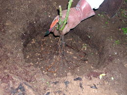 C肥料が根に触らないように、苗のつぎ目が地表から3cmくらい上に出るように土を戻し(苗の根がフィットするように山形に盛るのがコツ)、根を広げて苗を置きます。 |