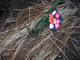 F苗が沈んだり揺れたりしないように支柱をして、藁など(腐葉土やピートモスでも可)でマルチングして出来上がり。