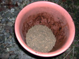 | @鉢底に赤玉土を敷きます。 |