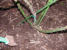 早く植えた場合、上の方の芽が伸び出しますが、2月になったら半分から三分の一のところで切り、新しい芽を出させます。 |